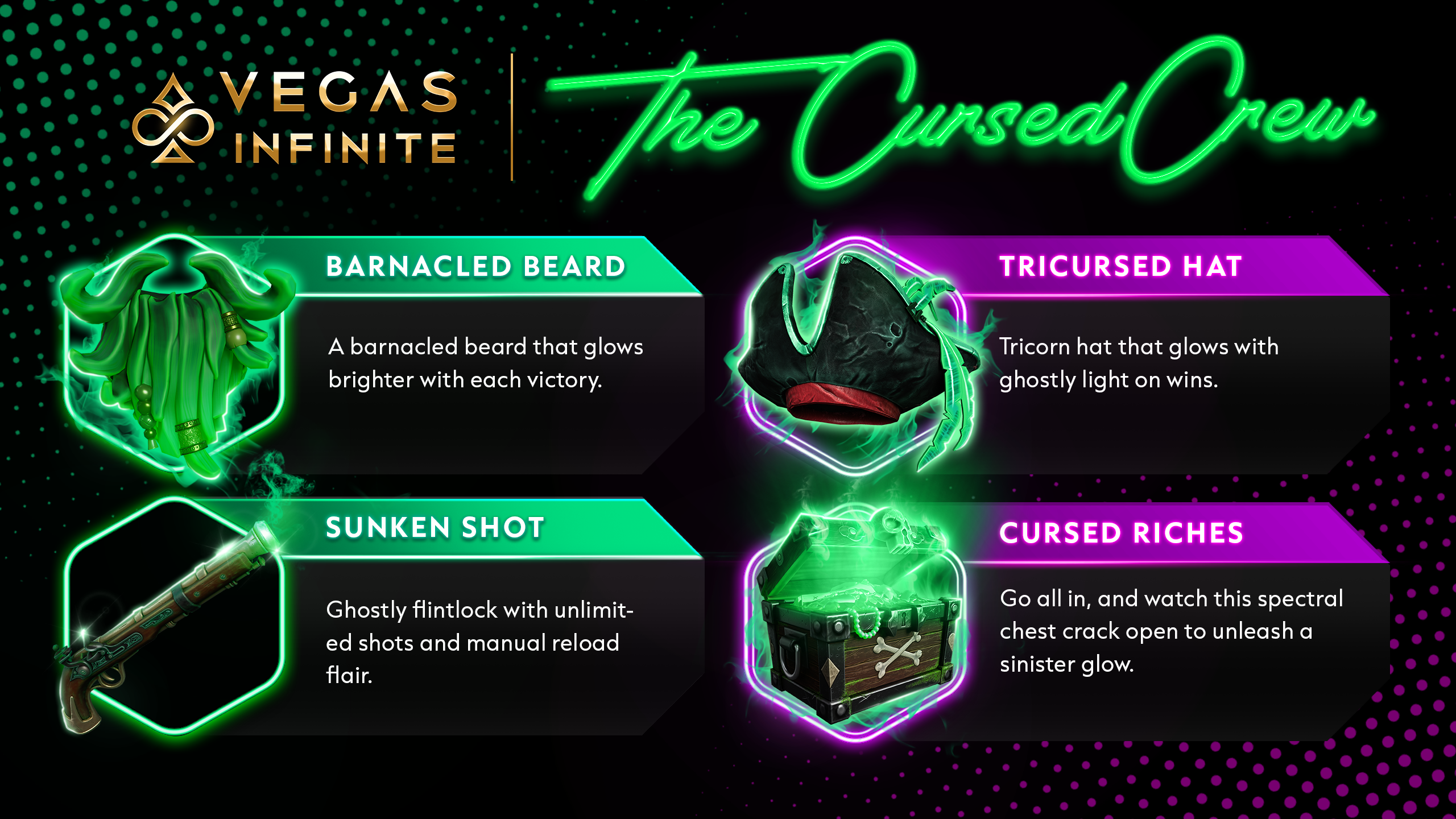 Join the scallywags of October’s Sub Box: The Cursed Crew! Plunder the tables with the Cursed Riches All-In Button, a treasure that glows with ghostly gold every time you stake it all. Top it off with the Tricursed Hat, a wicked hat fit for any haunted captain. Whether you’re chasing fortune or stirring up mischief, the crew’s cursed loot will keep your night sailing smooth!