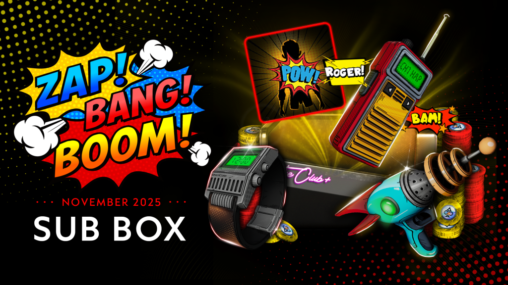 November’s Sub Box explodes with comic book energy! Flash your style with the Talking Hand, fire up the Zapper Blaster, make a bold entrance with POW! EEVFX, and express yourself with the Quackie Talkie!