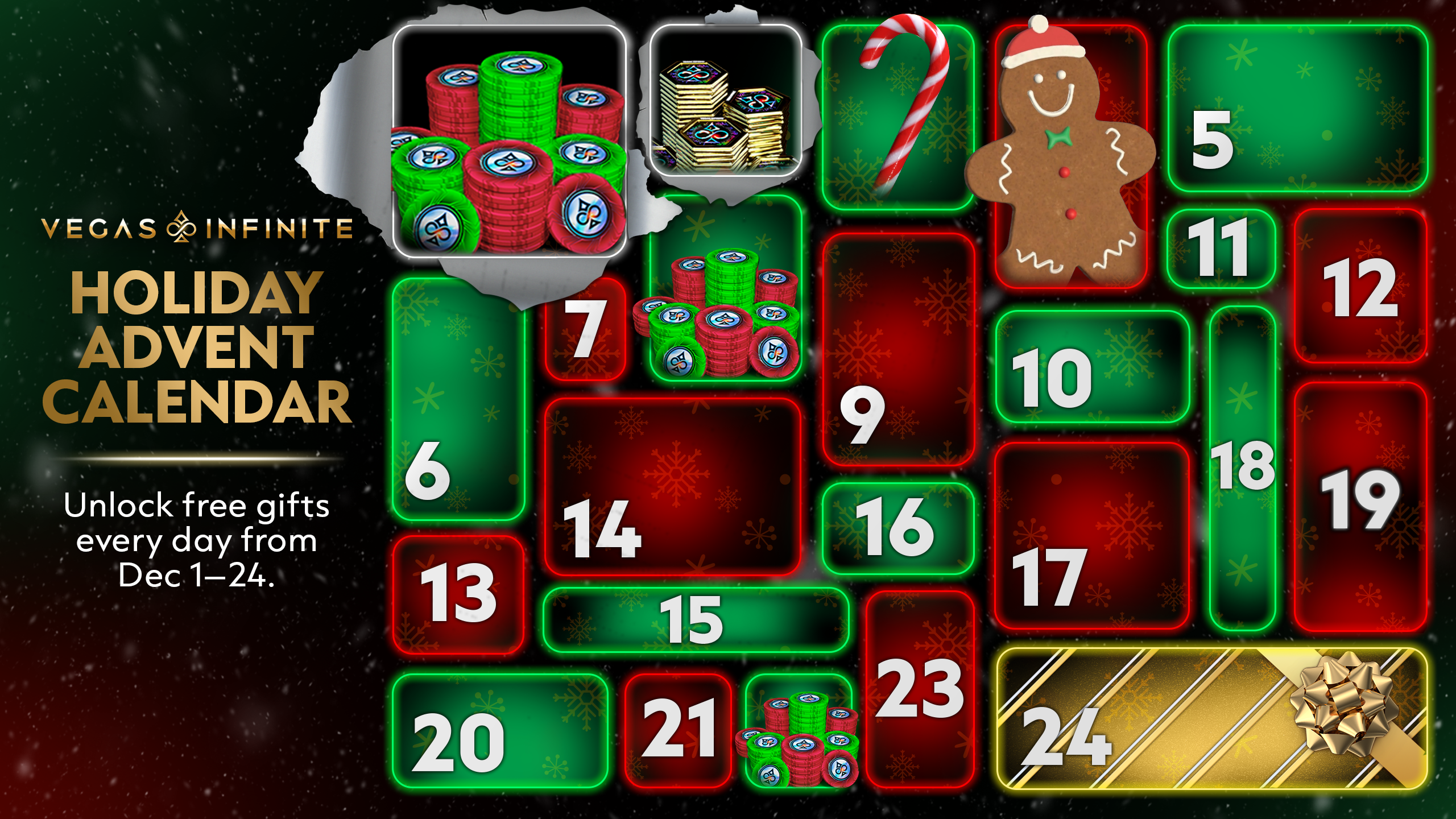 Celebrate the season in style! Log in to Vegas Infinite every day and open a brand-new holiday envelope packed with festive treats, free rewards, and unexpected surprises. A new envelope unlocks each morning at 7am ET, available daily until December 24th. Come back every day and see what awaits you!